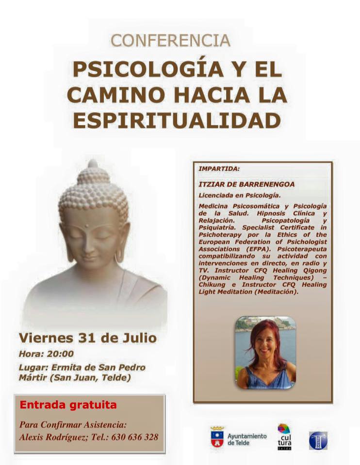 El próximo viernes 31 de julio a las 20:00 horas la Psicóloga Itziar de Barrenengoa impartirá por primera vez en Canarias y convirtiéndose en noticia de gran interés, una charla bajo el título: “Psicología y el camino hacia la espiritualidad” en la ermita de San Pedro Mártir en Telde. Además impartirá un seminario de Chi Kung el próximo 1 y 2 de Agosto en el Centro Tara Blanca en Las Palmas de Gran Canaria.