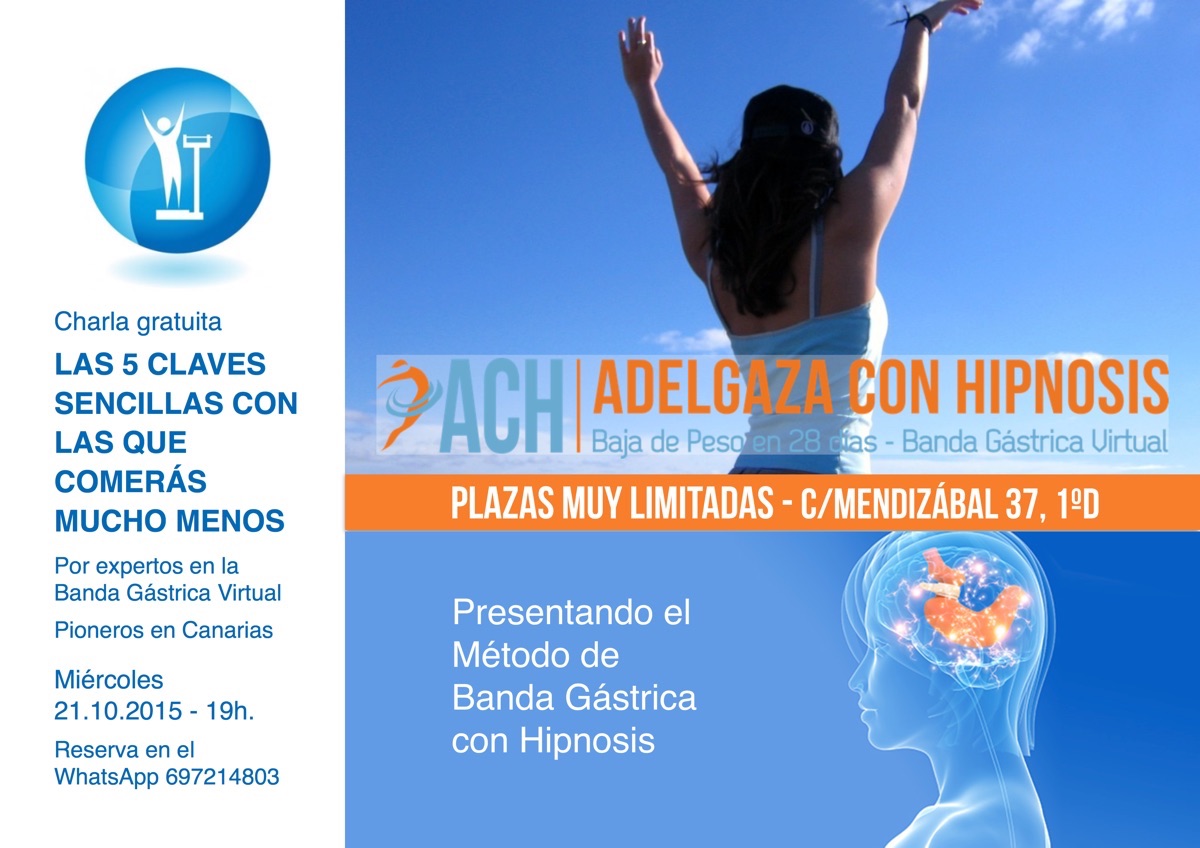 hipnosis para adelgazarHoy comenzaremos hablando de una charla que va a tener lugar el próximo miércoles 21 de Octubre en Gran Canaria, ¿Sabían que se puede adelgazar con hipnosis? Pues si, y para hablar de ello contaremos con  Juan Jesús Doreste, Director del Instituto Canario de Hipnosis y de la Escuela Canaria de Hipnosis, no se lo pierdan. Además de informarles sobre otras actividades que van a tener lugar en Canarias.