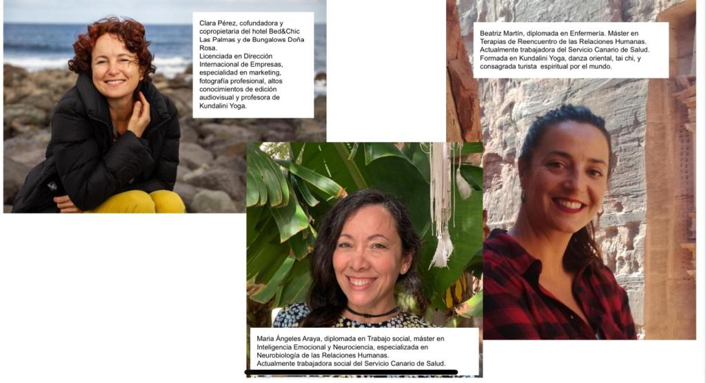 Estará con nosotros Clara Pérez, cofundadora y copropietaria del hotel Bed&chic Las Palmas y de bungalows Doña Rosa. Licenciada en dirección internacional de empresas, especialidad en marketing, fotografía professional, altos conocimientos de edición audiovisual y profesora de kundalini yoga. Y Beatriz Martin diplomada en enfermería , master en terapias de reencuentro de las relaciones humanas. Actualmente es trabajadora del servicio canario de salud. Formada en kundalini yoga, danza oriental, tai chi y consagrada turista spiritual por el mundo.
