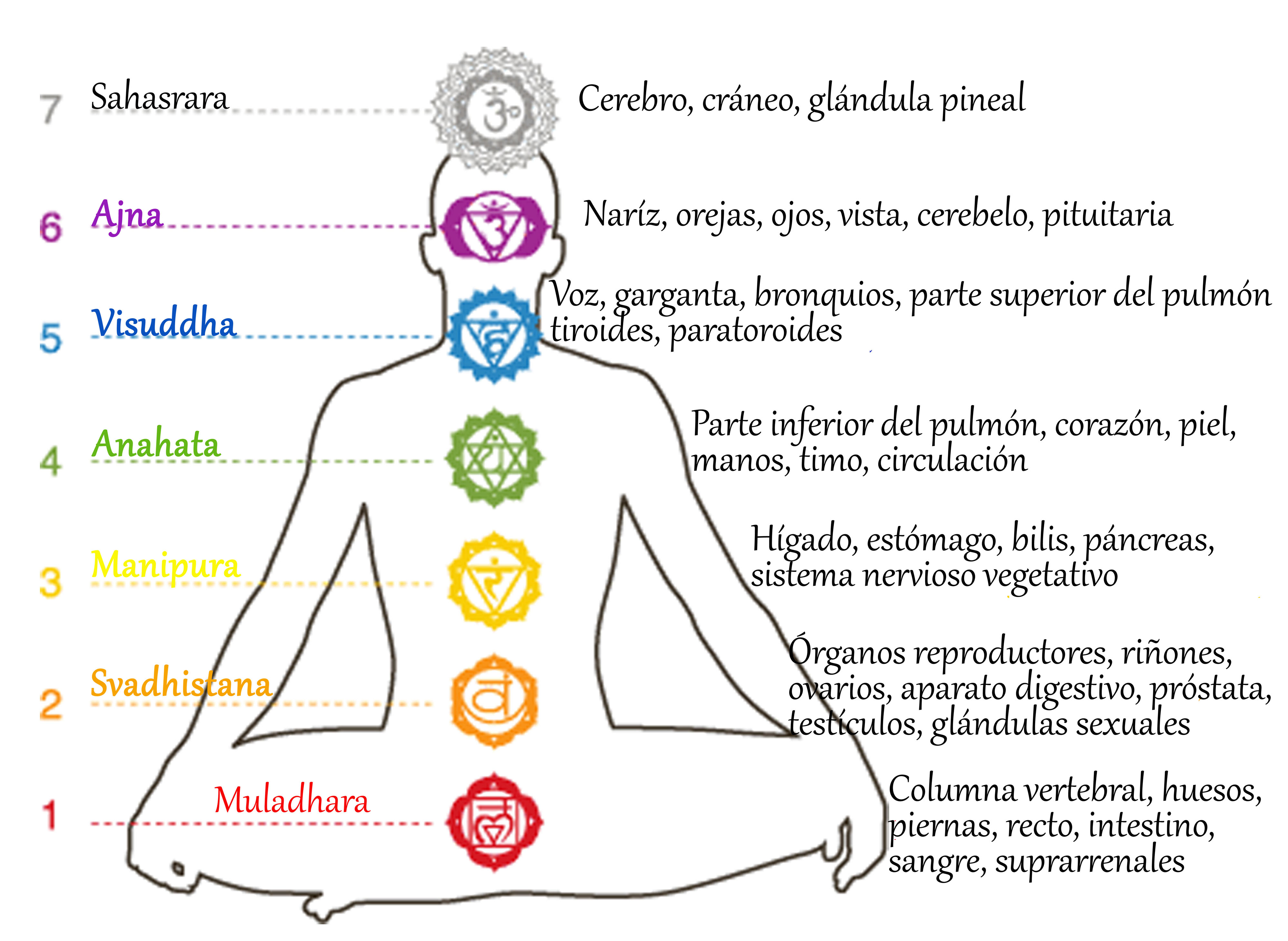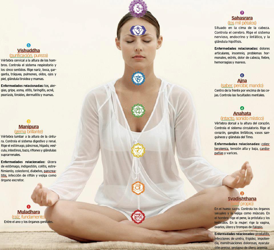 Chakra quiere decir rueda en sánscrito. En la ciencia yóguica, se definen como centros giratorios de energía que reciben, regulan y distribuyen el prana, o la energía vital que fluye por nuestros cuerpos sutiles a través de nuestros canales energéticos (nadis, o lo que en la medicina china se conoce como meridianos, en cuyo caso el prana se conoce como chi). Los chakras principales son siete, y están ubicados justo delante de la columna vertebral de manera ascendente. Esta energía es la misma que nos da vitalidad, y que se transforma en diferentes tipos de vibraciones que están conectadas con diferentes formas de la energía universal: la supervivencia, la sensualidad, el poder personal, el amor, la expresividad, la intuición y la espiritualidad.